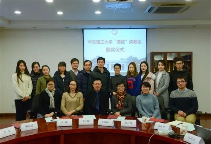 2018年1月24日,首届华东理工大学“浩登”奖教金颁奖仪式在华东理工大学隆重举行,我公司董事长沈健先生、董事会秘书胡艳女士受邀参加,出席本次颁奖仪式的还有有华理工商学院副院长董临萍老师、华理工化工学院党委副书记高艺霞老师、华理工材料学院党委副书记戴诚安老师、华理工资环学院党委副书记饶志雄老师、华理工商学院团委书记陈庆升老师、华理工商学院团委副书记丁一老师、华理工商学院校友中心袁竹君老师、冯承才老师、姜楠老师及获奖师生代表。